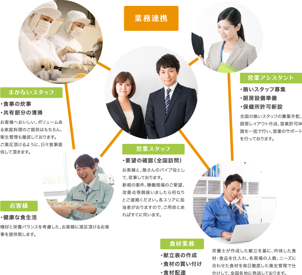建設現場・船内食堂・学生寮・ホテルなど…幅広いニーズにお応えした、まかない提供サービスを行っています。